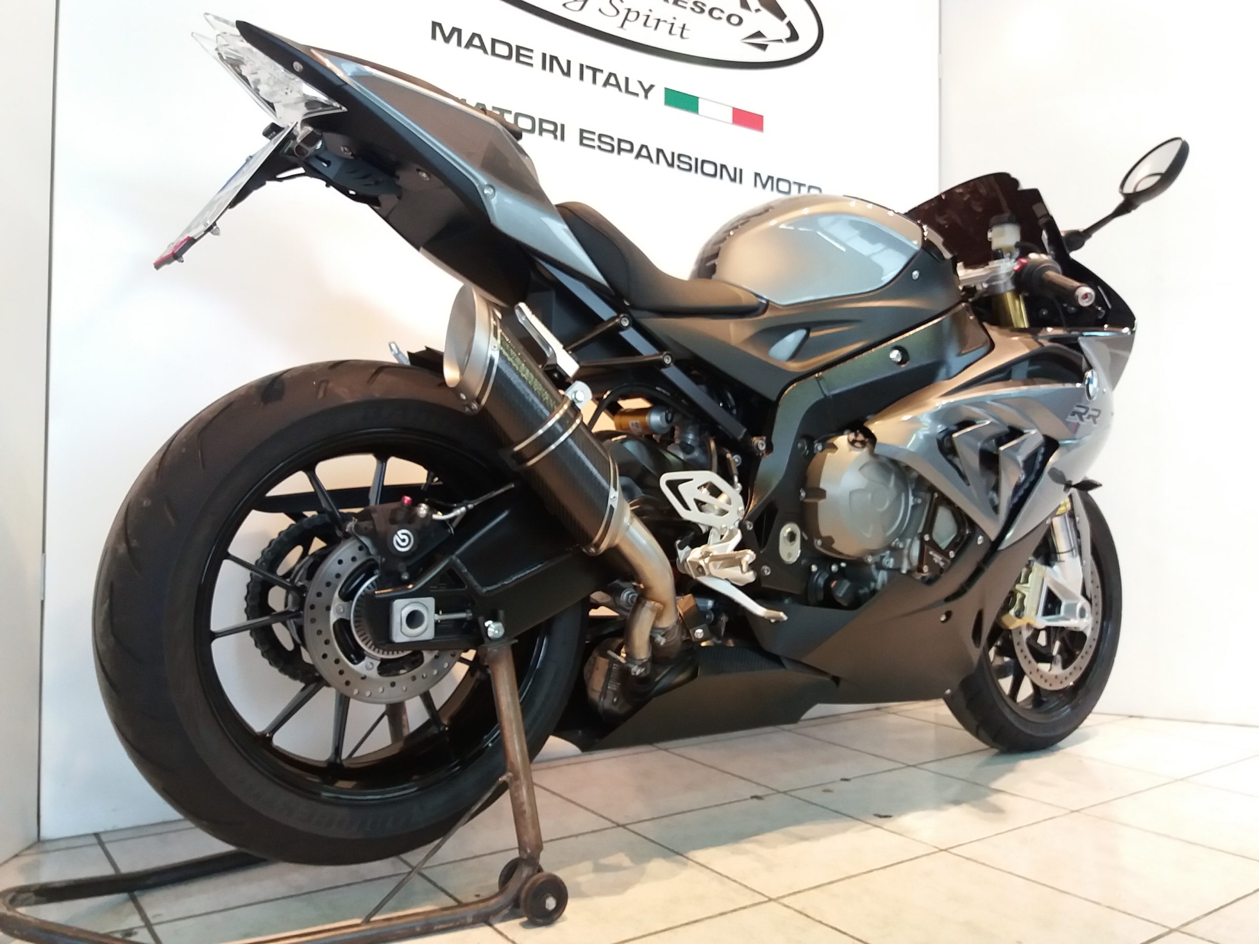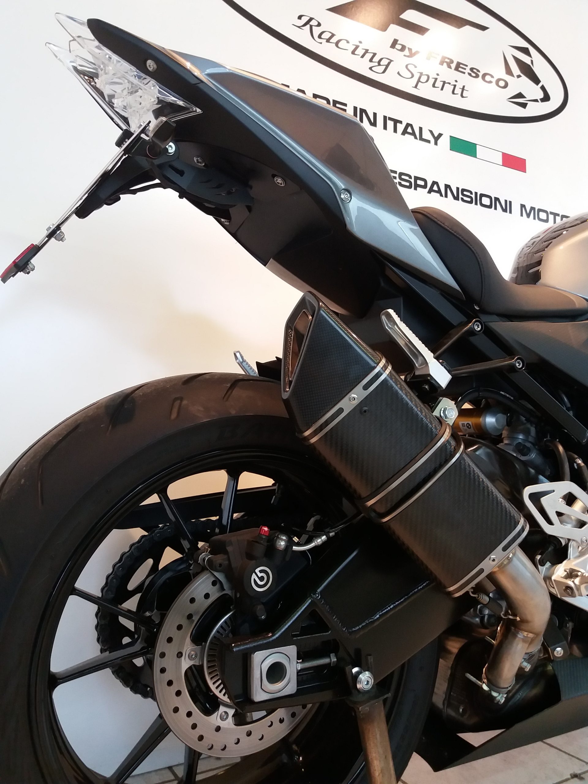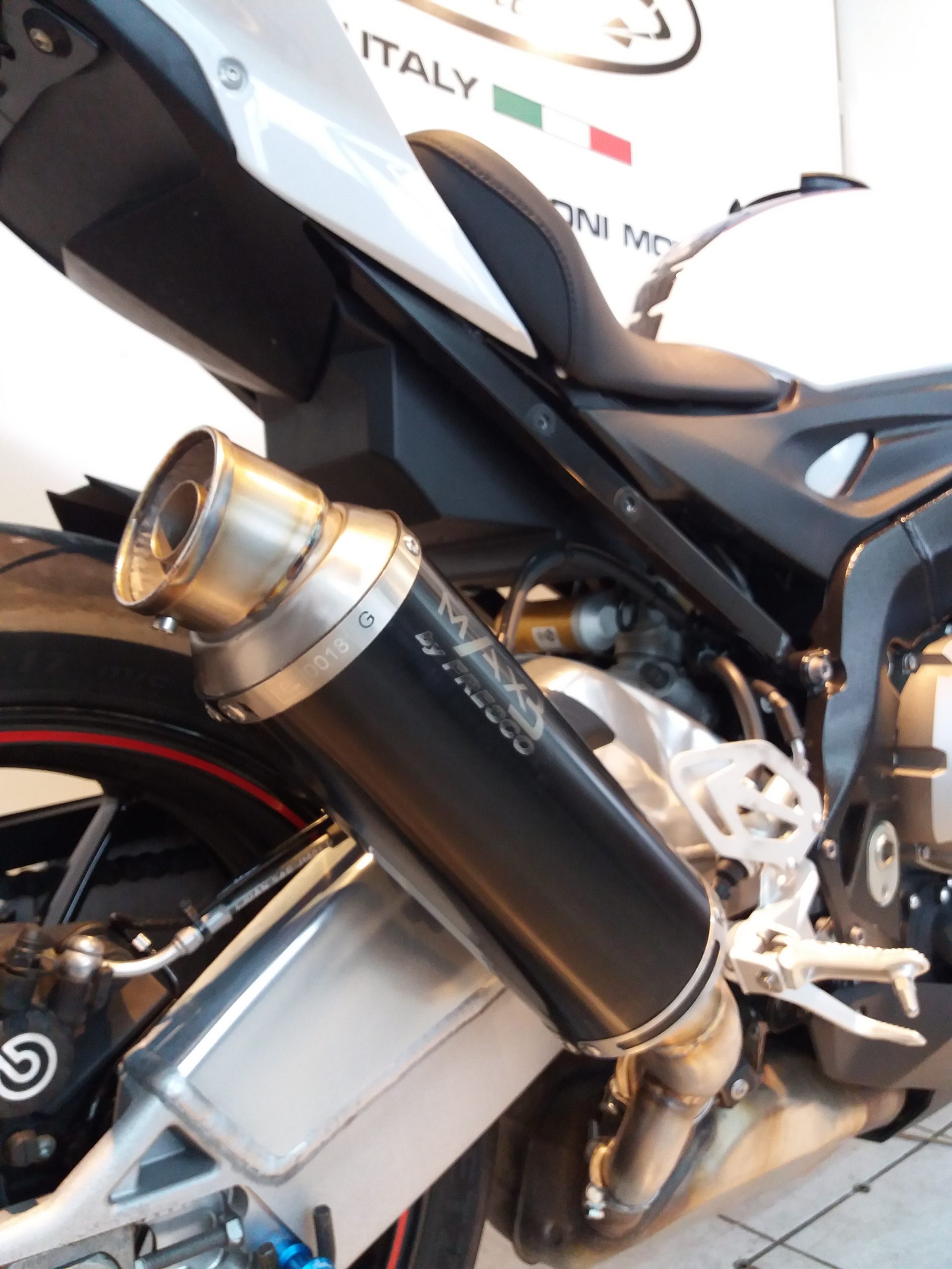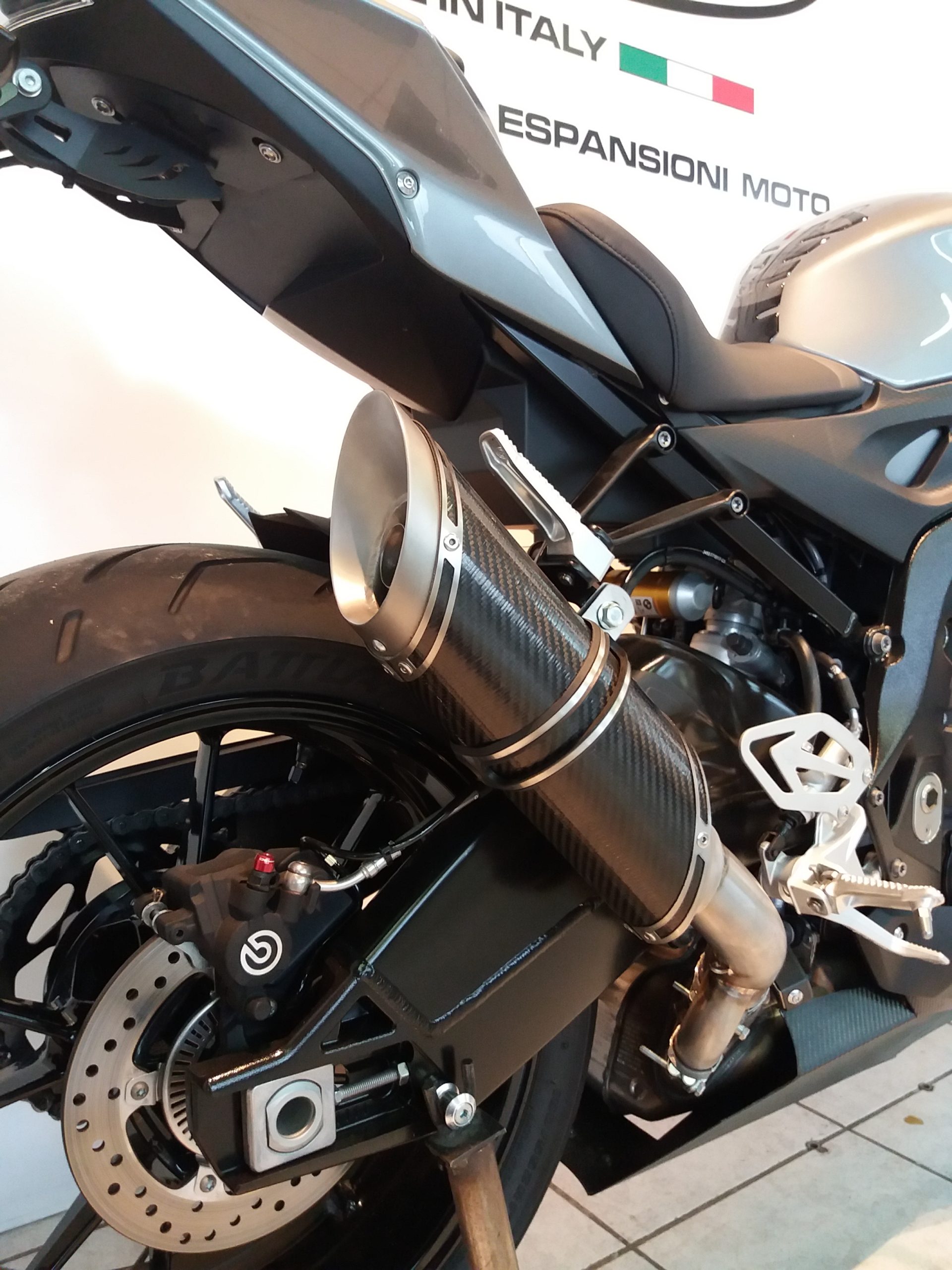 Sistema di scarico omologato con stampigliatura laser sul terminale, DB Killer e certificato cartaceo di omologazione.